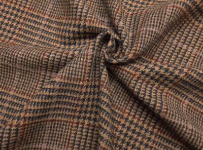 Tessuto in lana cardata morbida Principe di Galles fondo cammelloTessuto Principe di Galles ad armatura Twill – la più utilizzata nei tessuti di drapperia per le caratteristiche di robustezza e versatilità – prodotto in Italia in pura lana merino cardata. Ha peso medio e mano abbastanza morbida. Consigliato per la realizzazione per capi spalla femminil e gonne.