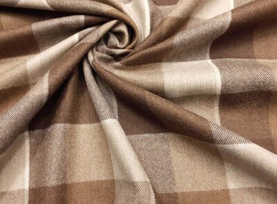 Tessuto in lana e cashmere a quadri marrone, beige e verdeTessuto a riquadri ad armatura Twill – la più utilizzata per le caratteristiche di robustezza e versatilità – prodotto a Biella in pura lana e cashmere. Ha peso medio-alto, mano calda, morbida e non si stropiccia. Consigliato per la realizzazione di capi spalla femminili e gonne.
