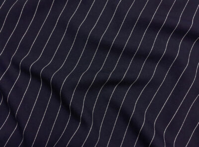 Tessuto in lana filato crepe blu gessatoRealizzato a Biella con filato crepe di pura lana, di peso medio è un tessuto che ha una mano scattante e caduta morbida, perfetto per realizzare capi spalla,pantaloni abitii e gonne. Caratterizzato da superficie liscia e moderatamente crespa, non si stropiccia e non è soggetto a ”pilling” grazie alla forte torsione del filato.