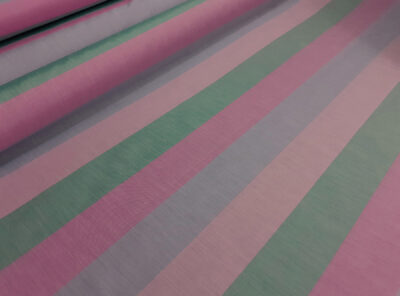 Seta Shantung a righe rosa e bianco. Setificio TaroniQuesto tessuto di seta, prodotto a Como dal setificio Taroni, è stato realizzato utilizzando filati shantung molto ritorti. Si presenta compatto, poco rilevato ma conserva le caratteristiche dello shantung ovvero la mano sostenuta e “croccante”. Ha un aspetto semi opaco conferito dall’ordito opaco e dalla trama lucida inoltre è un tessuto che non si stropiccia ed è resistente all’usura.