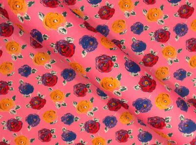 Popeline in cotone satinato fantasia floreale fondo rosaQuesto tessuto in puro cotone egiziano doppio ritorto, è un tessuto liscio, compatto e allo stesso tempo morbido e setoso al tatto. Si contraddistingue per una notevole lucentezza, una resistenza all’usura, al tempo e ai lavaggi. È perfetto per confezionare abiti e blouse ma può essere usato anche per capispalla.