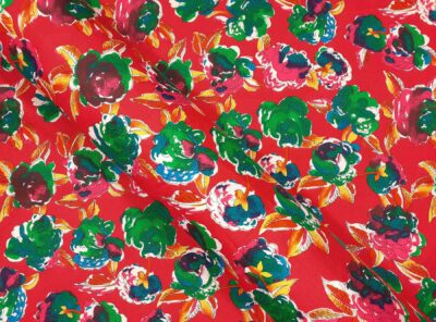 Tela in cotone fantasia floreale fondo rossoTessuto per abiti, gonne morbide e camicie di peso medioleggero in puro cotone mercerizzato e ritorto. Ha mano morbida e aspetto lucente che si ottiene con la classica armatura a tela dove ogni filo di ordito si intreccia con ogni filo di trama.