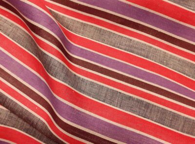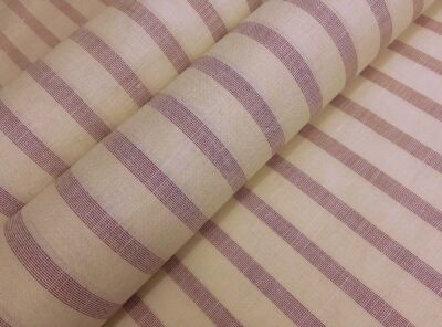 Tessuto in puro lino a righe porpora su fondo avorio.Il lino, con il suo fascino senza tempo e il suo elevato indice di comfort, è il tessuto ideale per le camicie estive in quanto luminoso, resistente, termoregolatore, ipoallergenico. Tessuto nobile apprezzato da sempre per la sua bellezza e resa cromatica evidenziata dalla tintura in filo.