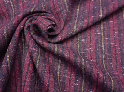 Tweed Donegal in lana a righe rosso e melanzanaQuesto Tweed Donegal, prodotto in Irlanda, ha la peculiare proprietà di mostrare sulla superficie del tessuto una serie di bottoncini di lana a colori contrastanti con il fondo e di essere rigorosamente intrecciato in armatura tela. Di peso medio viene usato come tessuto invernale per realizzare capi spalla, gonne e abiti.