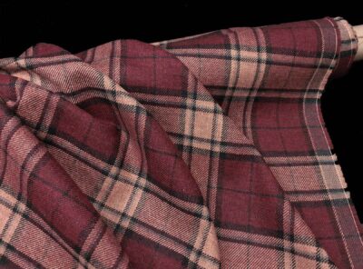 Tessuto in lana a riquadri bordeaux e beige rosatoTessuto scozzese ad armatura Twill – la più utilizzata per le caratteristiche di robustezza e versatilità – prodotto a Biella in pura lana pettinata. Ha peso medio, mano calda e morbida, non si stropiccia e non si usura nel tempo. Consigliato per la realizzazione di abiti e gonne.