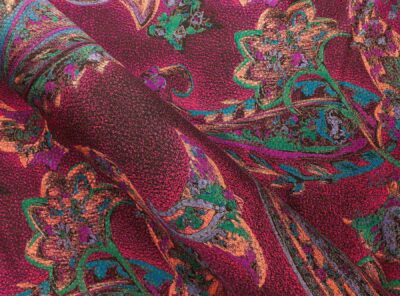 Seta jacquard fantasia cashmere su fondo rosso cremisiIn questo tessuto di seta pura, prodotto a Como, la lavorazione jacquard con il contrasto fra lucido e opaco, crea un piacevole effetto di tridimensionalità. Perfetto per la realizzazione di abiti ampi e sinuosi, grazie alla sua morbidezza e caduta, può essere utilizzato anche per capi più lineari che mettono in evidenza la ricchezza e la particolarità di questo tipo di tessuto.