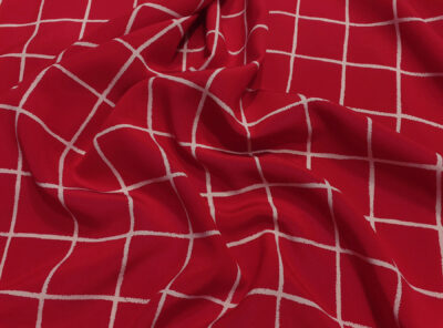 Crepe de Chine in seta fantasia geometrica su fondo rossoLa Crepe de Chine in pura seta, prodotta a Como, è un tessuto semi-opaco che si ottiene da una trama opaca che contrasta la lucentezza dell’ordito. Caratterizzata da mano leggera e morbida viene utilizzata per realizzare camicie, top, abiti e gonne morbide, pantaloni eleganti, lingerie etc.