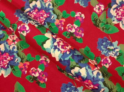 Raso di seta fantasia floreale su fondo rosso. Ungaro Haute CoutureIl raso di seta pura è caratterizzato da una mano morbida, una lucentezza elegante e una buona caduta. Perfetto per la realizzazione di abiti, camicie, top e foulard.