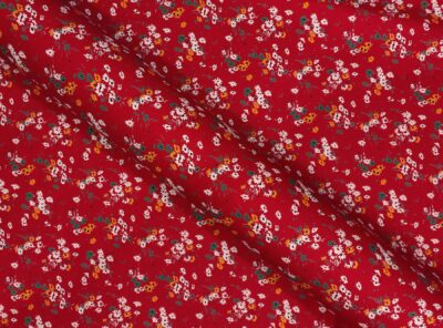 Popeline in cotone satinato fantasia floreale fondo rosso.Questo tessuto in puro cotone egiziano doppio ritorto, è un tessuto liscio, compatto e allo stesso tempo morbido e setoso al tatto. Si contraddistingue per una notevole lucentezza, una resistenza all’usura, al tempo e ai lavaggi. È perfetto per confezionare abiti e blouse ma può essere usato anche per capispalla.