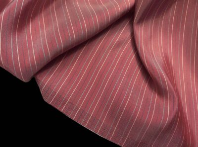 Seta per camicie tinta in filo a righe multicolori su fondo granata chiaro melangeLa seta tinta in filo – con colori quindi più resistenti – viene utilizzata per realizzare tessuti per camicie da uomo e donna. Ha mano morbida e moderatamente tesa.