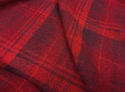 Tessuto crepe scozzese rosso e tinta melanzanaRealizzato a Biella con filato crepe di lana, di peso medio-alto è un tessuto che ha una mano scattante e caduta morbida, perfetto per realizzare capi spalla,abitii e gonne. Caratterizzato da superficie liscia e moderatamente crespa, non si stropiccia e non è soggetto a ”pilling” grazie alla forte torsione del filato.
