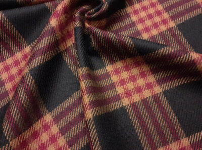 Tessuto in lana merino disegno scozzese bordeaux su neroTessuto scozzese ad armatura Twill – la più utilizzata per le caratteristiche di robustezza e versatilità – prodotto a Biella in pura lana pettinata. Ha peso elevato, mano calda, non si stropiccia e non si usura nel tempo. Consigliato per la realizzazione di capi spalla e gonne.