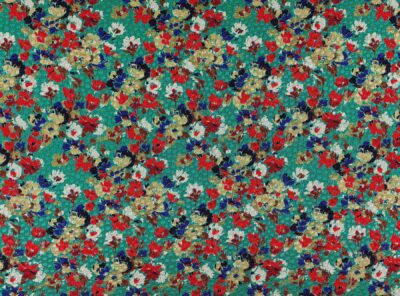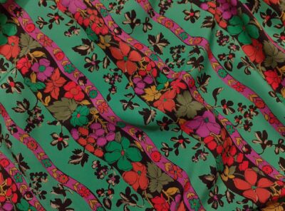 Crepe de Chine in seta fantasia a fiori e righe trasversali su fondo verdeLa Crepe de Chine in pura seta, prodotta a Como, è un tessuto semi-opaco che si ottiene da una trama opaca che contrasta la lucentezza dell’ordito. Caratterizzata da mano leggera e morbida viene utilizzata per realizzare camicie, top, abiti e gonne morbide, pantaloni eleganti, lingerie etc.