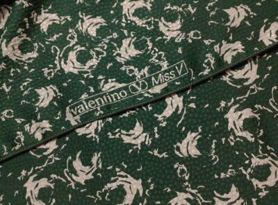 Seta jacquard fantasia floreale su fondo verde scuro. Valentino Miss VIn questo tessuto di seta pura, prodotto a Como, la lavorazione jacquard con il contrasto fra lucido e opaco, crea un piacevole effetto di tridimensionalità. Perfetto per la realizzazione di abiti ampi e sinuosi, grazie alla sua morbidezza e caduta, può essere utilizzato anche per capi più lineari che mettono in evidenza la ricchezza e la particolarità di questo tipo di tessuto.