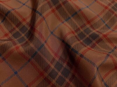 Crepe de Chine in seta Principe di Galles su fondo rameLa Crepe de Chine in pura seta, prodotta a Como, è un tessuto semi-opaco che si ottiene da una trama opaca che contrasta la lucentezza dell’ordito. Caratterizzata da mano leggera e morbida viene utilizzata per realizzare camicie, top, abiti e gonne morbide, pantaloni eleganti, lingerie etc.