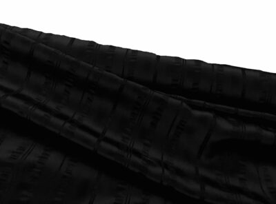 Seta crepon tinta nero con riga in rasoIl Crepon in pura seta è un tessuto semi opaco, le pieghe irregolari gli conferiscono un aspetto goffrato, grazie alla sua superficie mossa e “rugosa” ha il grande vantaggio di non sgualcirsi.