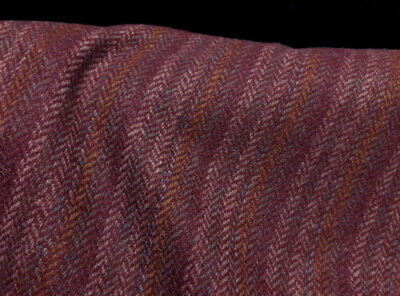 Tweed spigato fondo bordeaux realizzato in lana merino cardataQuesto tessuto, prodotto in Scozia, è caratterizzato da un intreccio di fili irregolari che formano il classico effetto “tweed” su trama spigata. Di peso elevato – perfetto per un clima piuttosto freddo – è prodotto con classici filati ruvidi e nervosi e viene usato per realizzare capi spalla e gonne.
