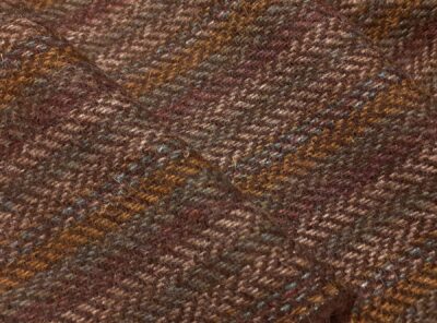 Tweed spigato fondo verde e marrone realizzato in lana merino cardataQuesto tessuto, prodotto in Scozia, è caratterizzato da un intreccio di fili irregolari che formano il classico effetto “tweed” su trama spigata. Di peso elevato – perfetto per un clima piuttosto freddo – è prodotto con classici filati ruvidi e nervosi e viene usato per realizzare capi spalla e gonne.