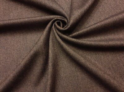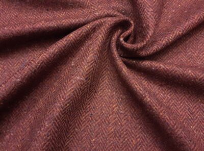 Tweed spigato morbido in lana merino tinta bordeaux e bruciatoQuesto tessuto a trama spigata, di produzione italiana, è caratterizzato da un intreccio di fili irregolari che formano il classico effetto “tweed”. Di peso medio e mano morbida viene usato come tessuto invernale per tailleur e abiti.