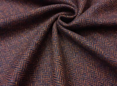 Tweed spigato morbido in lana merino tinta bruciato e bluQuesto tessuto a trama spigata, di produzione italiana, è caratterizzato da un intreccio di fili irregolari che formano il classico effetto “tweed”. Di peso medio e mano morbida viene usato come tessuto invernale per tailleur e abiti.
