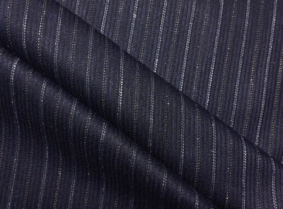 Tessuto in pura seta blu gessatoTessuto gessato ad armatura Twill – la più utilizzata nei tessuti di drapperia per le caratteristiche di robustezza e versatilità – prodotta a Biella in pura seta. Di peso medio non si stropiccia e non si usura nel tempo. Consigliato per la realizzazione di capi spalla femminili e gonne.
