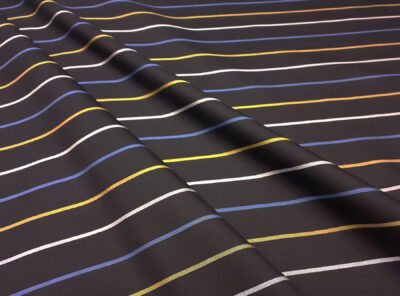 Tessuto per camicie tinto in filo righe giallo e blu su fondo neroQuesto tessuto, in puro cotone, tinto in filo (con colori quindi molto resistenti), è un tessuto leggero, liscio, compatto e allo stesso tempo morbido. Perfetto per confezionare camicie da uomo estive e camicie da donna.