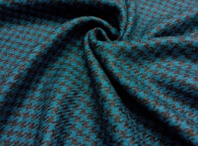Tessuto in lana alpaca pied de poule grigio e turcheseTessuto pied de poule ad armatura Twill – la più utilizzata nei tessuti di drapperia per le caratteristiche di robustezza e versatilità – prodotto in Scozia in pura lana alpaca. Ha peso medio-alto, mano calda e morbida, non si stropiccia e non si usura nel tempo. Consigliato per la realizzazione di capi spalla femminili e gonne.