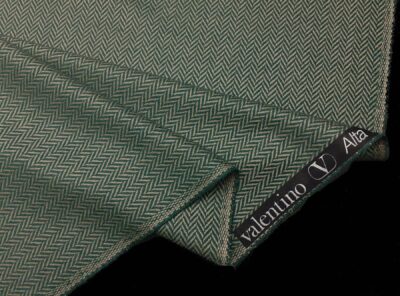 Tessuto in lana e cashmere spigato verde e tinta corda. Valentino Alta ModaTessuto spigato ad armatura Twill – la più utilizzata per le caratteristiche di robustezza e versatilità – prodotto a Biella per Valentino Alta Moda in pura lana merino e cashmere. Ha peso medio-alto, mano calda e morbida, non si stropiccia e non si usura nel tempo. Consigliato per la realizzazione di capi spalla femminili e gonne.