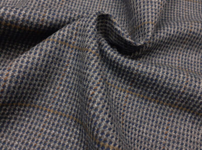 Tweed per giacche in lana merino cardata Principe di Galles blu su fondo cammello.Questo tessuto, prodotto dal lanificio Zegna Mario, è caratterizzato da un intreccio di fili che formano il classico effetto “tweed”. Di medio peso è stato prodotto con classici filati ruvidi e nervosi e viene usato come tessuto invernale per realizzare giacche da uomo ma anche capi spalla femminili e gonne.