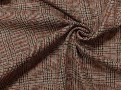 Tweed per giacche in lana merino cardata Principe di Galles bordeaux e verde su fondo cammello.Questo tessuto, prodotto dal lanificio Zegna Mario, è caratterizzato da un intreccio di fili che formano il classico effetto “tweed”. Di medio peso è stato prodotto con classici filati ruvidi e nervosi e viene usato come tessuto invernale per realizzare giacche da uomo ma anche capi spalla femminili e gonne.