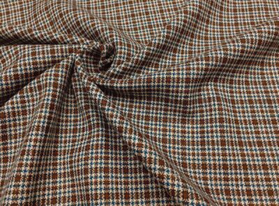 Tessuto in lana pettinata per giacconi a quadretti tabacco e petrolioTessuto a quadretti ad armatura Twill – la più utilizzata nei tessuti di drapperia per le caratteristiche di robustezza e versatilità – prodotto a Biella in pura lana merino pettinata. Di peso elevato, non si stropiccia e non si usura nel tempo. Consigliato per la realizzazione di giacconi.