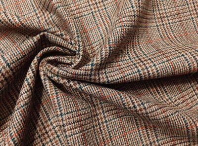 Tweed per giacche in lana merino cardata Principe di Galles verde e bruciato su fondo cammello.Questo tessuto, prodotto dal lanificio Zegna Mario, è caratterizzato da un intreccio di fili che formano il classico effetto “tweed”. Di medio peso è stato prodotto con classici filati ruvidi e nervosi e viene usato come tessuto invernale per realizzare giacche da uomo ma anche capi spalla femminili e gonne.