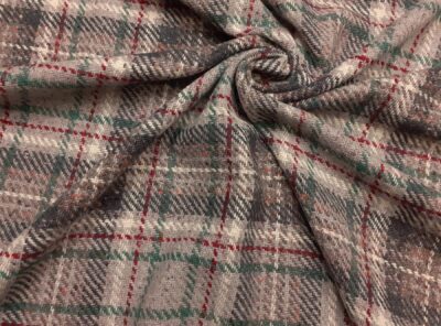 Tessuto in lana scozzese fondo grigio perla con riquadro rosso e verdeTessuto scozzese ad armatura Twill – la più utilizzata per le caratteristiche di robustezza e versatilità – prodotto a Biella in lana, mohair e fibre tecniche. Ha peso elevato, mano calda e morbida e non si stropiccia. Consigliato per la realizzazione di capi spalla femminili e gonne.