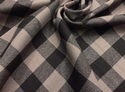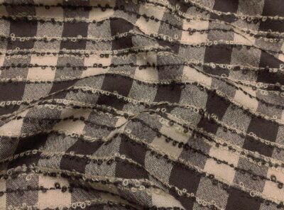Tessuto in lana merino quadretti beige e marrone con riga bouclèTessuto di peso medio-leggero in lana, realizzato a Biella con la classica armatura a tela dove ogni filo di ordito si intreccia con ogni filo di trama e trama bouclè. Ha mano calda e compatta perfetto per realizzare capi spalla, abiti e gonne.