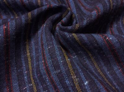 Tweed Donegal in lana disegno a righe su fondo azzurroQuesto Tweed Donegal, prodotto in Irlanda, ha la peculiare proprietà di mostrare sulla superficie del tessuto una serie di bottoncini di lana a colori contrastanti con il fondo e di essere rigorosamente intrecciato in armatura tela. Di peso medio viene usato come tessuto invernale per realizzare capi spalla, gonne e abiti.
