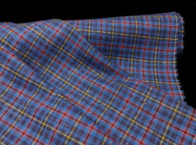 Tweed Donegal in lana disegno scozzese su fondo azzurroQuesto Tweed Donegal, prodotto in Irlanda, ha la peculiare proprietà di mostrare sulla superficie del tessuto una serie di bottoncini di lana a colori contrastanti con il fondo e di essere rigorosamente intrecciato in armatura tela. Di peso medio viene usato come tessuto invernale per realizzare capi spalla, gonne e abiti.