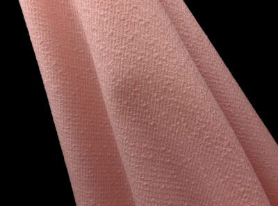 Tessuto Chanel in pura lana rosaIn questo tessuto Chanel – con armatura a stuoia – gli effetti di filatura bouclé e frisé sono intrecciati con filati pettinati più resistenti. La mano è morbida e corposa, ideale per la realizzazione di capispalla, abiti e gonne.