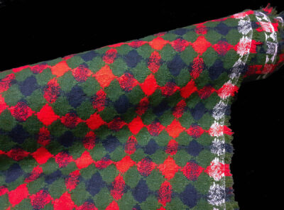 Chanel in lana merino a losanghe blu e rosse su fondo verdeIn questo tessuto Chanel – con armatura a stuoia – gli effetti di filatura bouclé e frisé sono intrecciati con filati pettinati più resistenti. La mano è morbida e corposa, ideale per la realizzazione di capispalla, abiti e gonne.