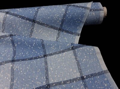 Lana pettinata effetto tweed su riquadro celeste. AgnonaQuesto tessuto, prodotta dal lanificio Agnona, è caratterizzato da un intreccio di fili irregolari che formano il classico effetto “tweed”. Di peso medio e mano morbida viene usato come tessuto invernale per taileur e abiti.