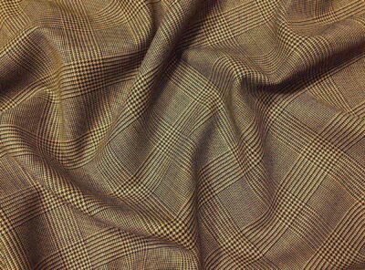 Tessuto tasmania in lana doppio ritorta Principe di Galles giallo e neroQuesto tessuto realizzato a Biella in lana di Tasmania, ha come caratteristica l’estrema sottigliezza della fibra e quindi il massimo della leggerezza. Adatto capi spalla, pantaloni e abiti si contraddistingue per morbidezza al tatto, resistenza, comfort e vestibilità.